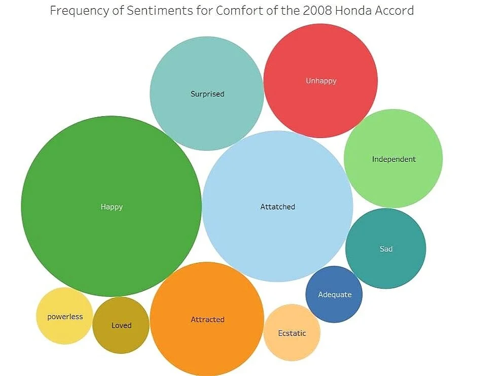 Results indicated that for the 2008 Honda Accord, customer comments indicated that they were happy with the performance and comfort of the vehicle. This included emotional sentiments such as “satisfied” and “comfortable”.