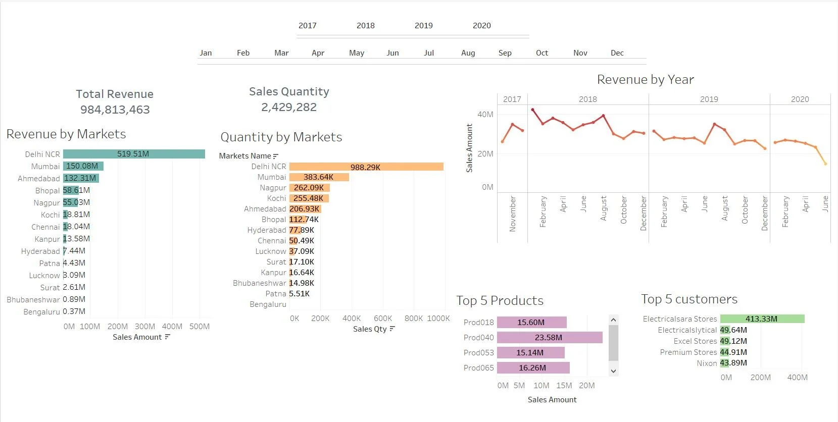 The best part about the interactive version is the filter system I used when finishing the dashboard. You can view revenue trends by year, customer, top product, and market with one simple click. This was created to mimic the way I would use Tableau in a workplace.